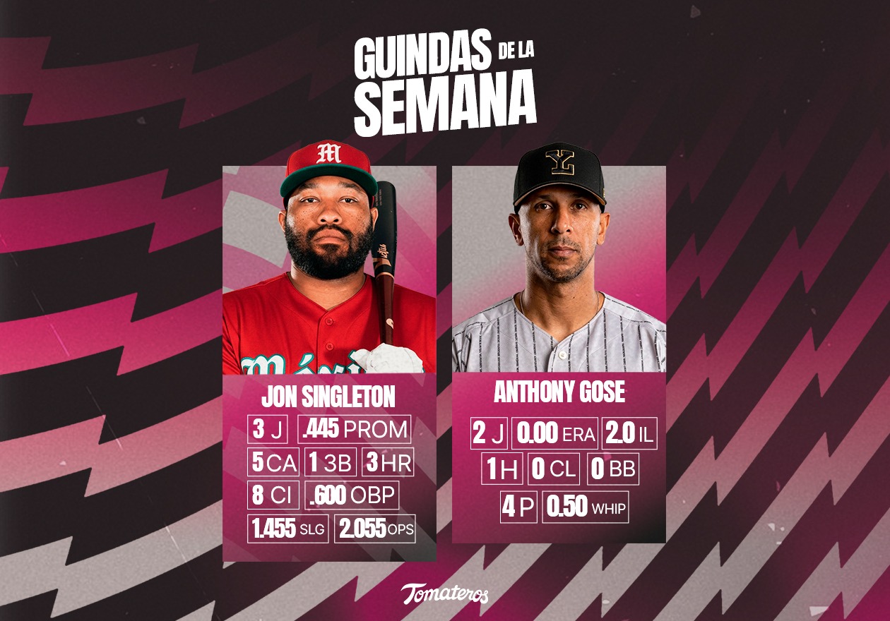 CULIACÁN, SINALOA.- Dos peloteros de Tomateros dominaron la semana en su temporada de verano en la LMB. Jon Singleton desde el plato y Anthony Gose desde el montículo son los Guindas de la Semana. Uno cargó el bat durante tres juegos. El otro salió al montículo en dos ocasiones y cerró cada una en ceros.